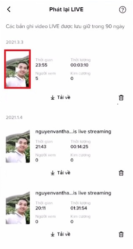 Ngoài ra bạn cũng có thể lựa chọn xóa bản lưu của buổi livestream này khỏi hệ thống của TikTok bằng cách chọn biểu tượng thùng rác. Bạn cũng có thể tải video ghi lại buổi livestream đó bằng cách chọn mục Tải xuống